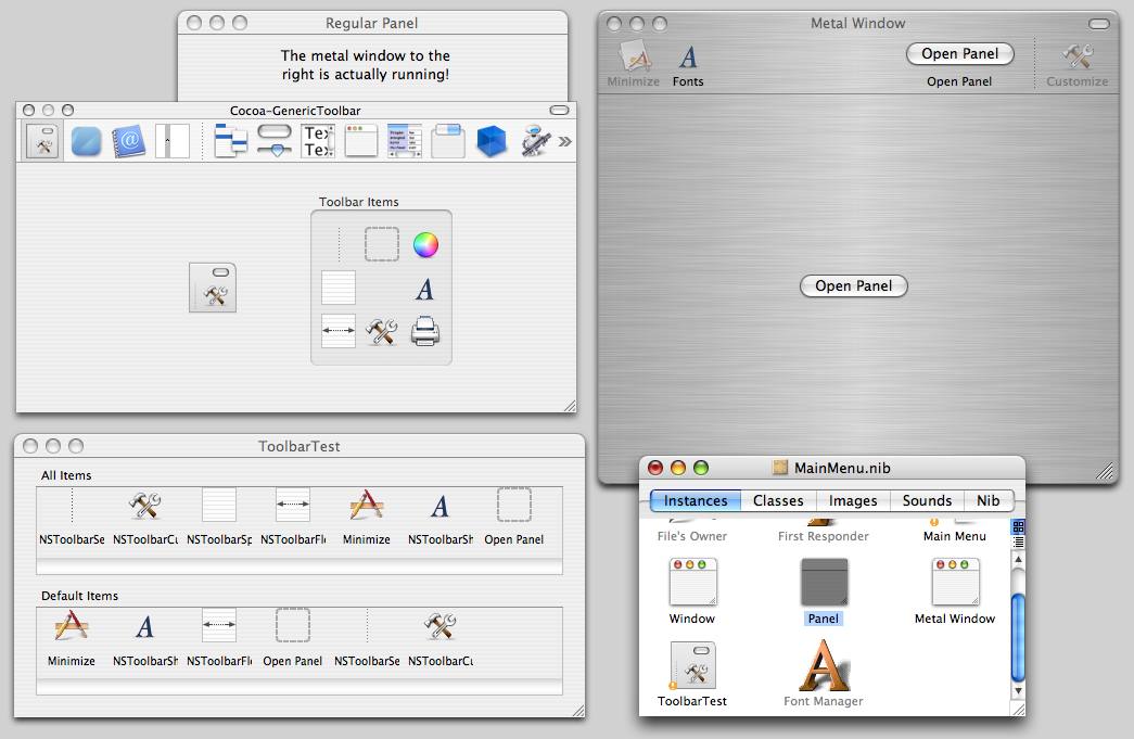 The old GenericToolbar package contains an Interface Builder 2 palette and a set of classes to include in your project, most notably the NSCoding-compliant subclasses of NSToolbar and NSToolbarItem. The DragMatrix class used extensively in the palette was created by Sailesh Agrawal. Note that this may create a problem if you try to make a (different) class called DragMatrix and use it in IB.